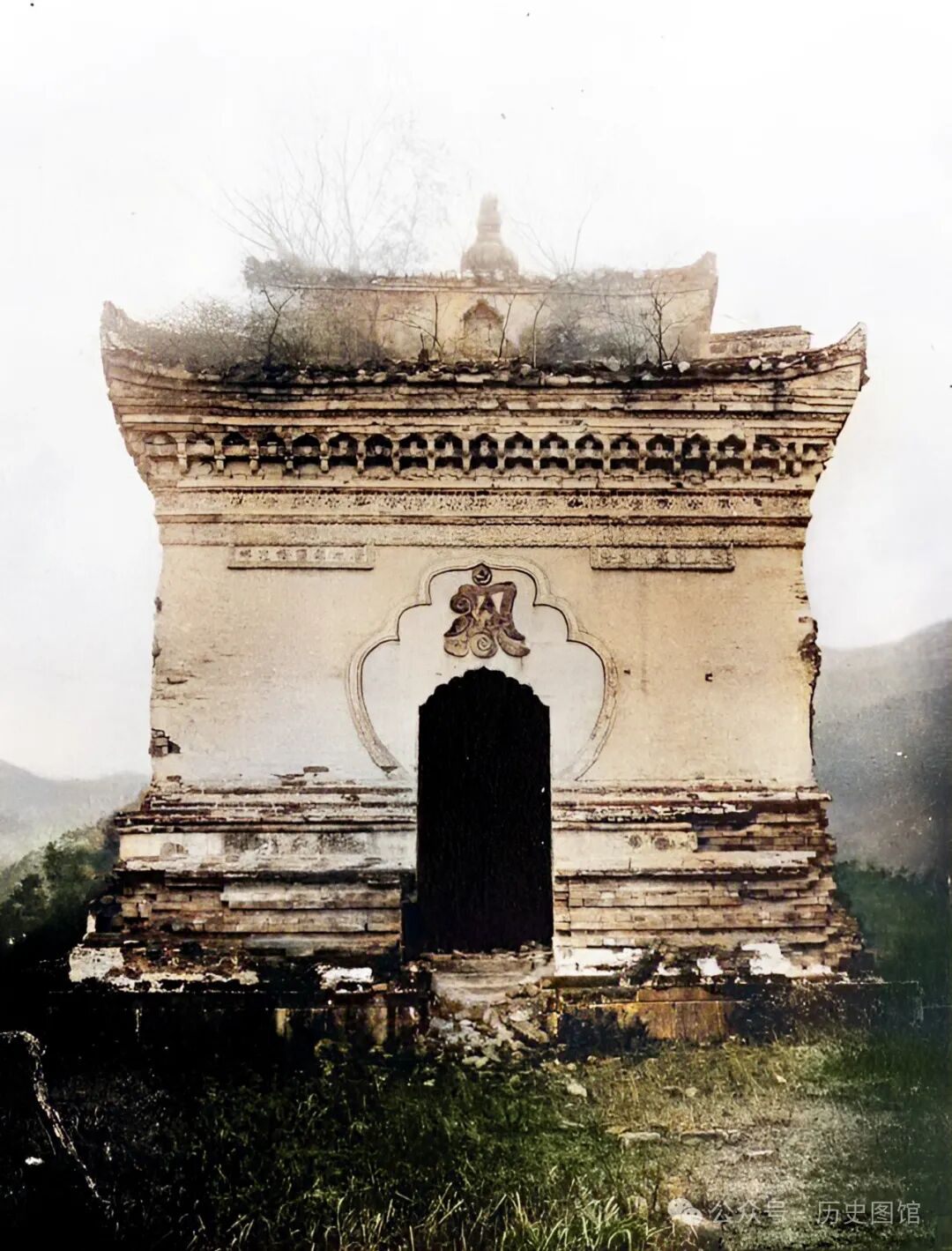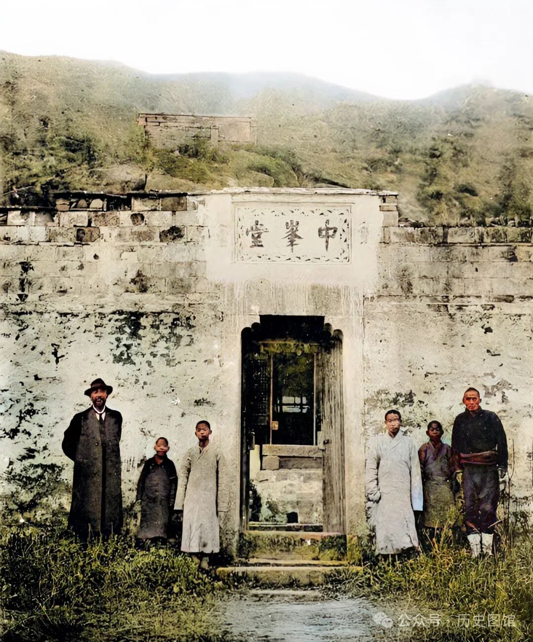 20年代,位于湖北省黄梅县的中峰堂前,日本摄影师常盘大定和几名僧人在门前合影。