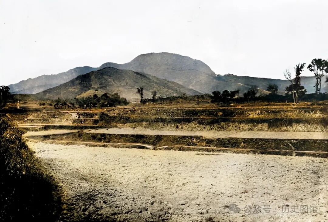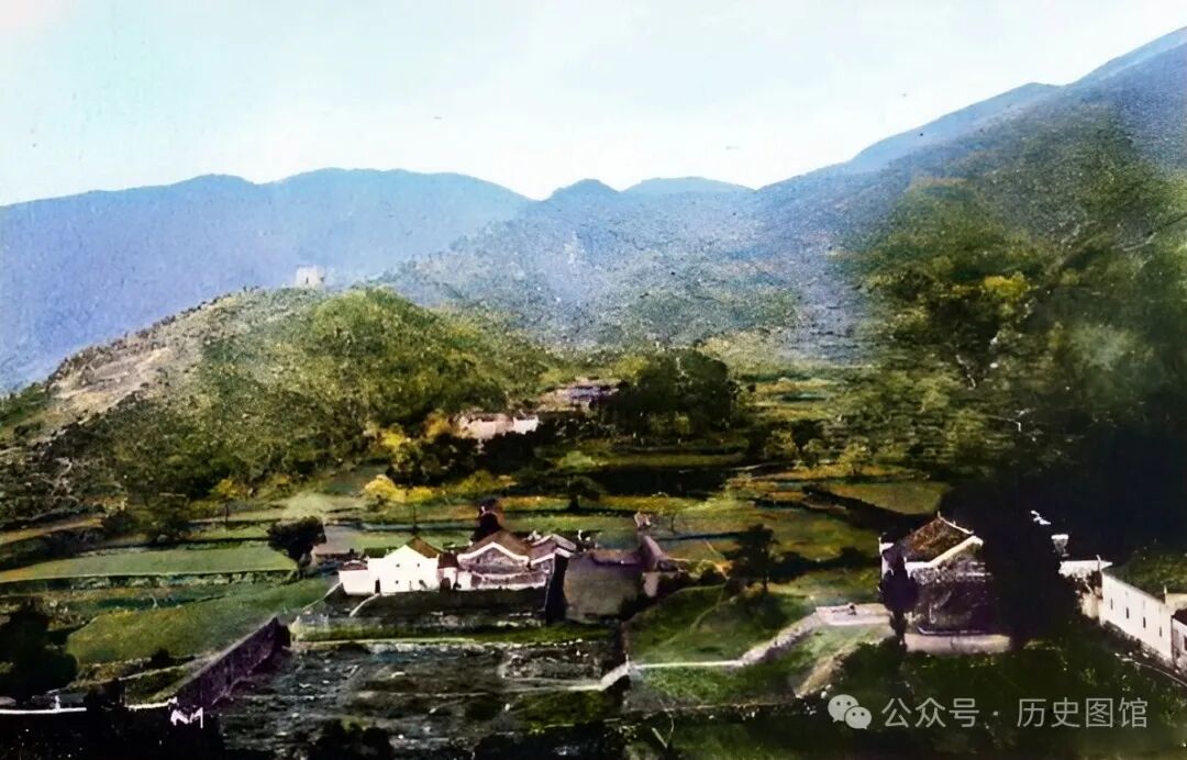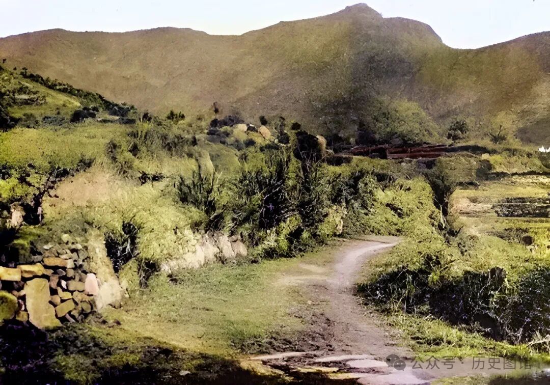 20年代,黄梅县四祖山景象。这是一条进山的必经之路,山路蜿蜒曲折,路旁是农田。道路尽头,还能看到一些民居房屋。远处,山峦起伏,连绵不绝。