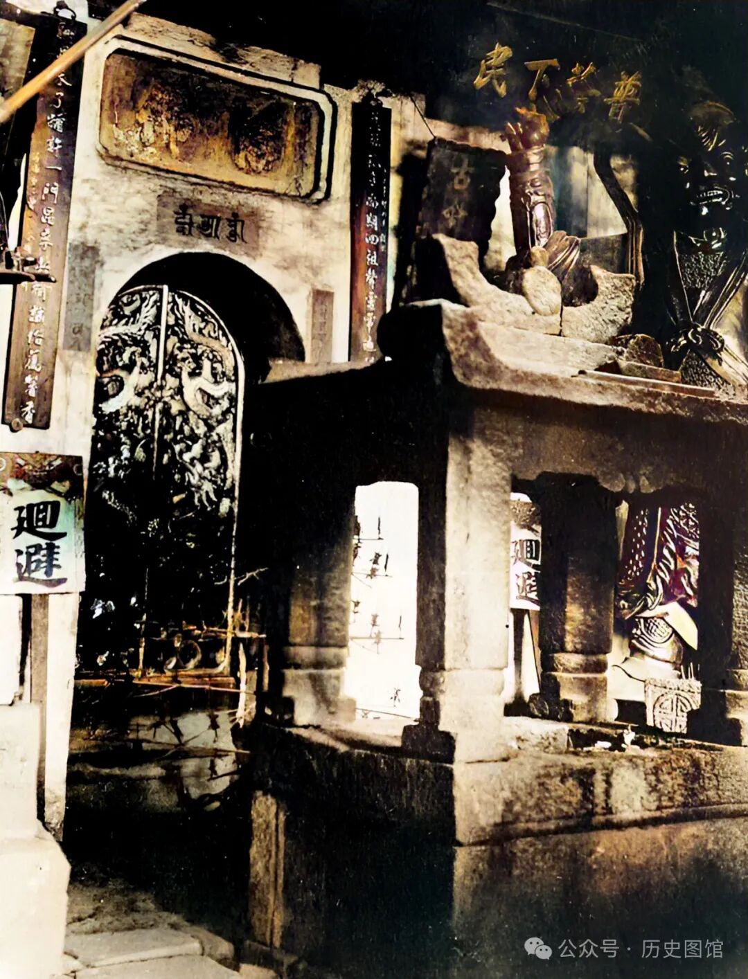 这是位于正觉寺内的四祖龛。由石头雕刻而成,十分精美。石龛后,有“回避”字样的牌子。佛龛,即供奉佛像、神位等的小阁子,中国古代的石窟雕刻一般是神龛式。