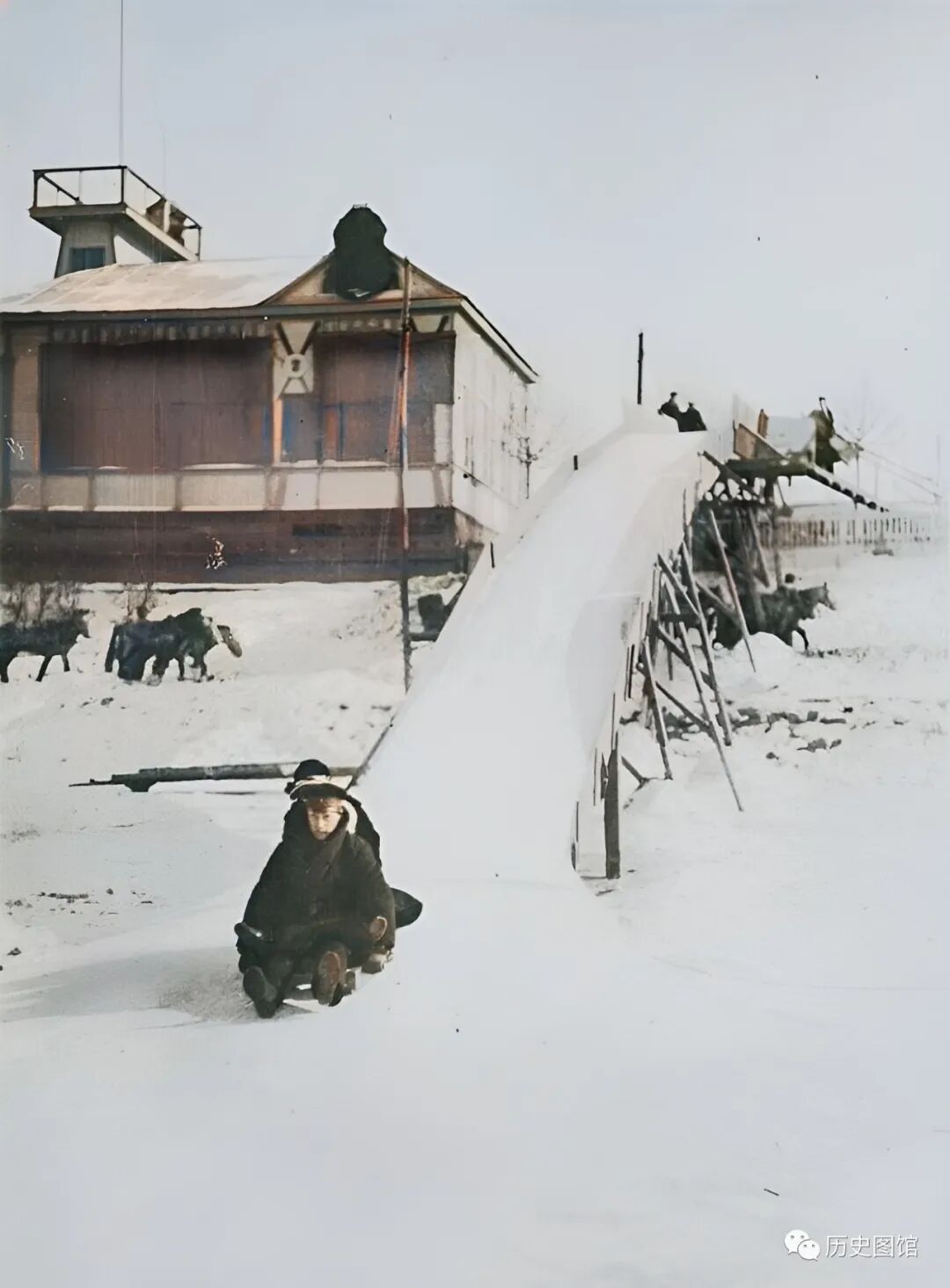 1925年冬天,两名男子正在哈尔滨一处冰雪游乐场上玩耍。这是用木头搭建的一座冰雪滑道,两名男子乘坐雪橇从高处滑下。滑梯下面,有一群牛羊奔跑。现在的哈尔滨,是有名的冰城,冬季更好玩。