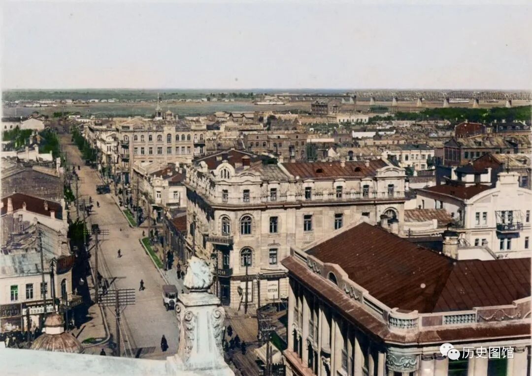 1924年,站在高楼上俯瞰哈尔滨城区,街道宽敞笔直,两侧设置有绿化带。