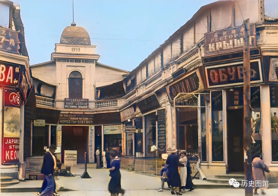 在一些门店的招牌上,能看到日文、俄文等。所以,这里有很多国家的店铺,可以说一直都是时尚潮流的聚集地。这张照片是1934年的万国洋行面貌。