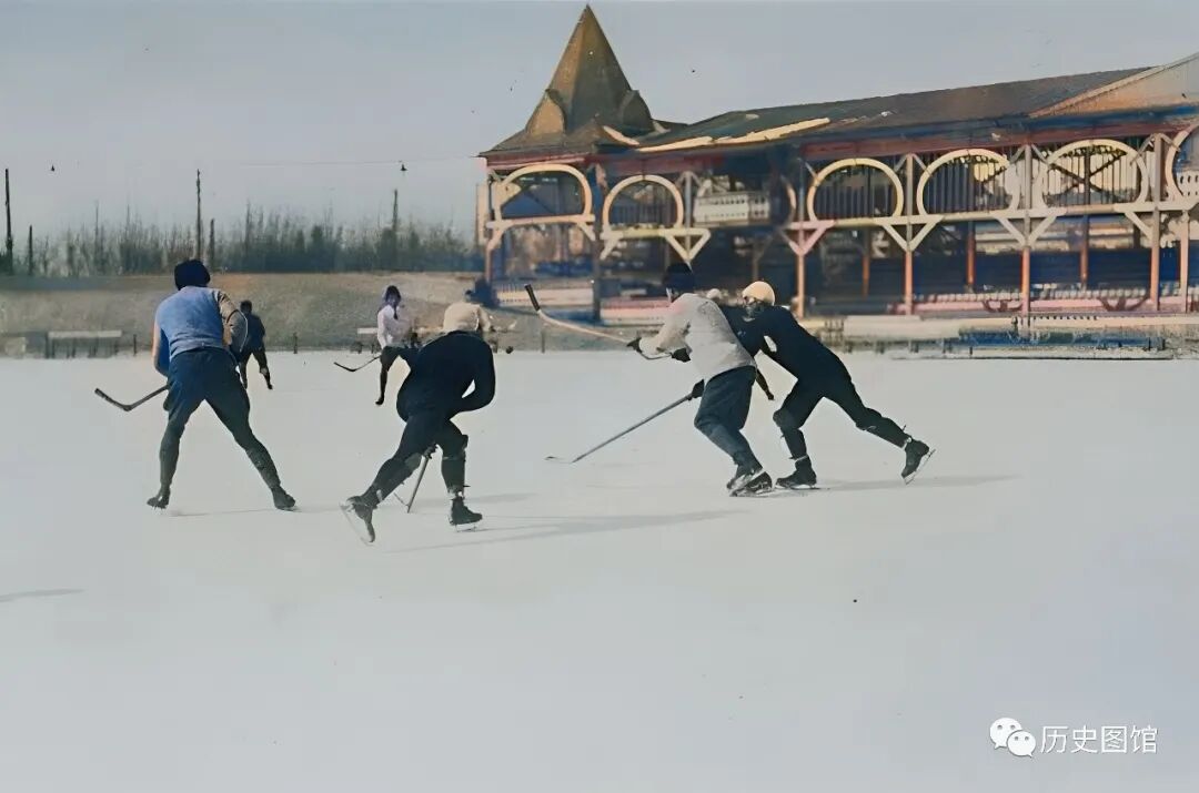 冰球在欧洲比较盛行,随着外国人来到哈尔滨,冰球这项体育运动也被带到了这里。照片中这座冰球场规模不小、也很有档次。照片拍摄于1925年。