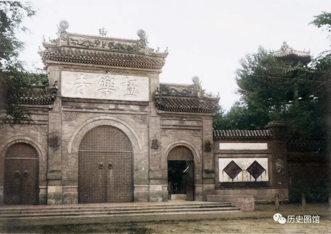 这是1934年的哈尔滨极乐寺牌坊式山门,建造精美。寺院内有钟鼓楼、天王殿、大雄殿和三圣殿等。