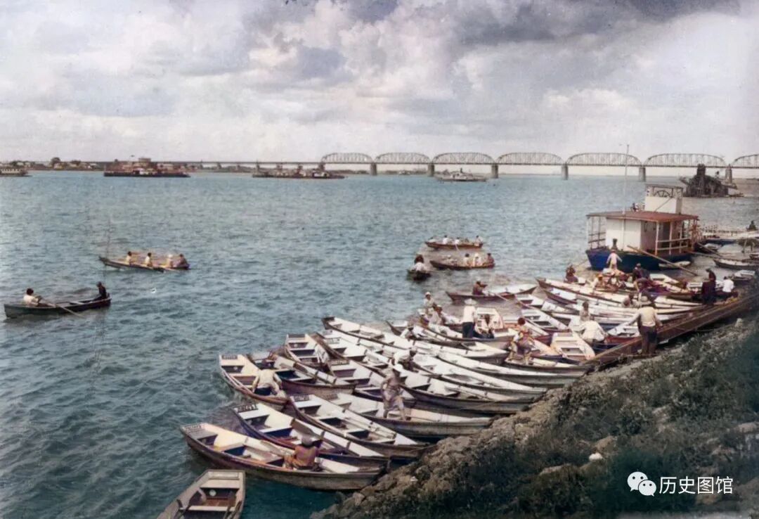 远处,一座铁路桥横跨在江面上。这张照片拍摄于1934年。