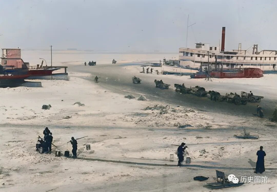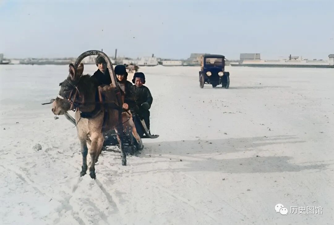几辆拉货的马车沿着冰面向前走。还有一些人,凿开冰面,用扁担往外挑水。这张照片拍摄于1925年。
