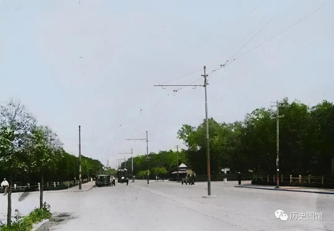 这是当时哈尔滨的街道,街道平坦宽敞,路两侧绿树成荫,已经与现代城市街道很相似。