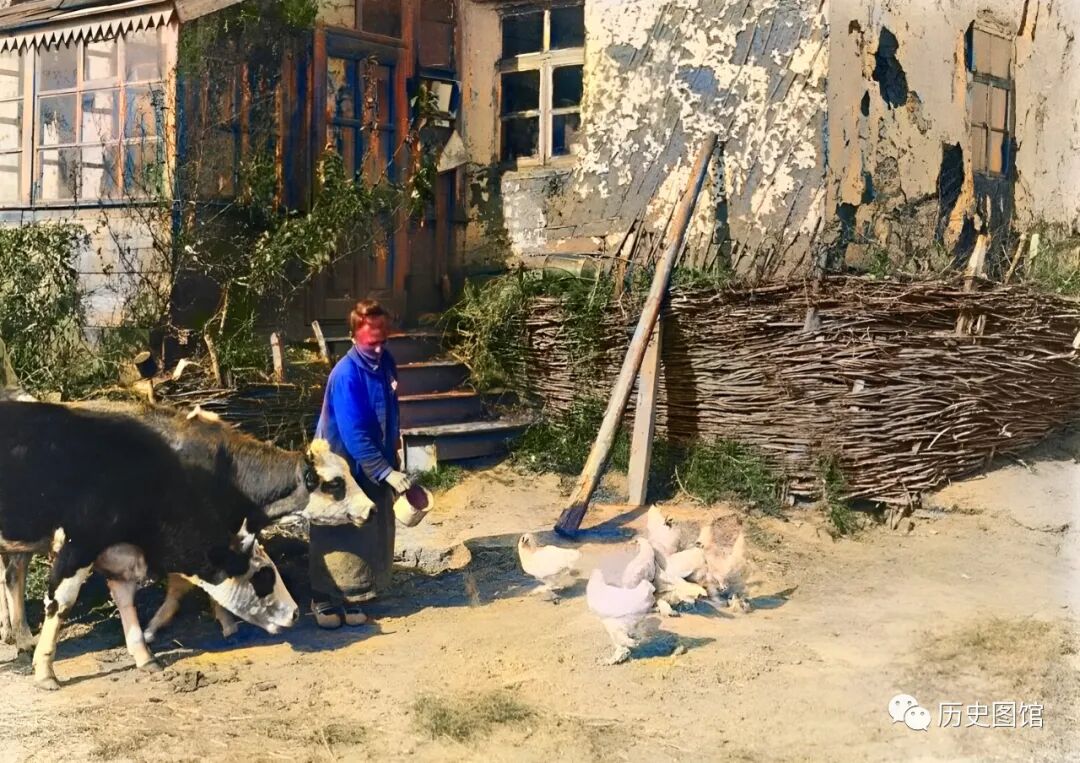 夕阳西下,他正在房子前面喂鸡,两头牛也来凑热闹。这张照片拍摄于1924年。