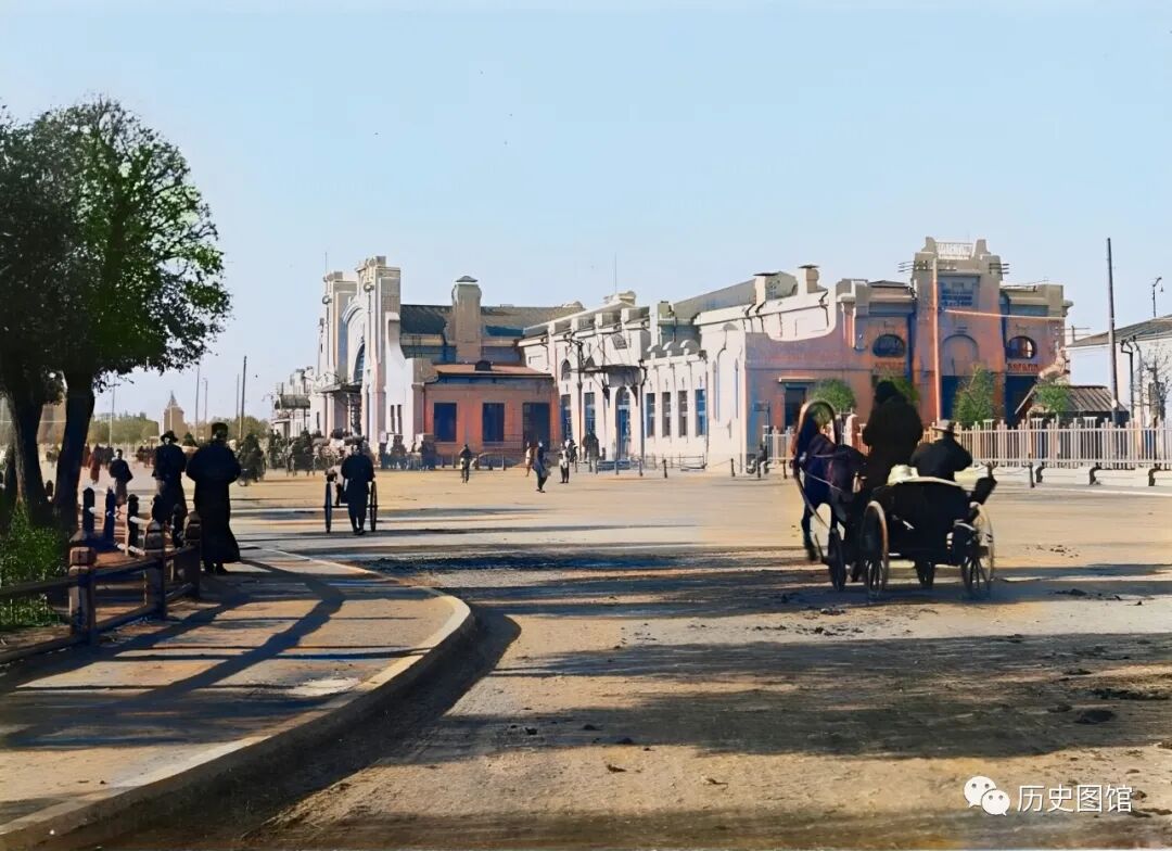 这张照片拍摄于1924年,当时的哈尔滨火车站,站房充满了异国情调,站前马路上,停着很多马车,正在等待旅客装运行李。