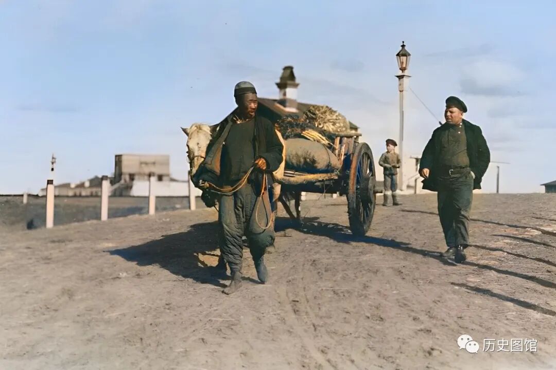 1924年,马路上走来一辆马车,车夫是一名中国人,穿着棉衣棉裤。他牵着马,车上拉着一些货物。