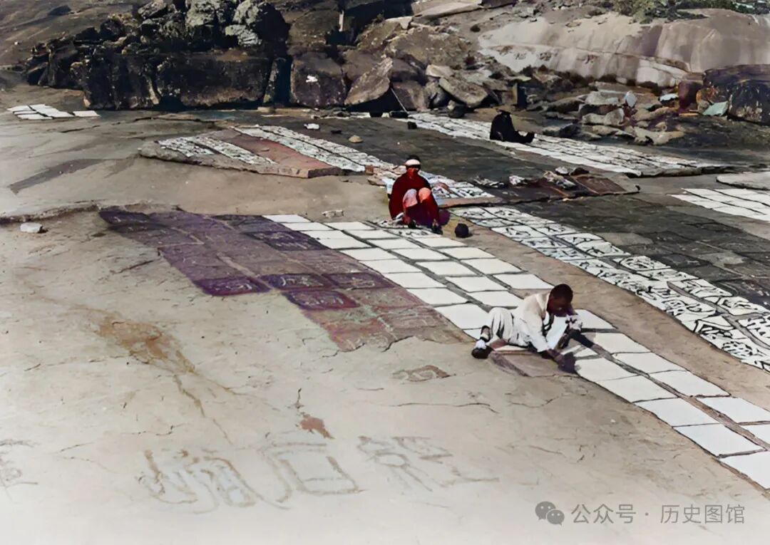 在泰山斗母宫东北的山谷河床的石坪上,雕刻有隶书《金刚经》。两名男子正在小心地用宣纸拓印石头上的文字。
