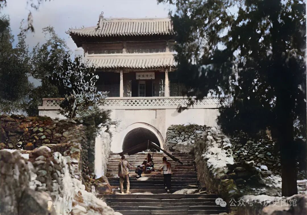 这是20年代,位于泰山的仙云楼前景象。这也是登临泰山途中一座跨道城楼。城门前有石头台阶,城台上有重檐城楼。没有什么游客,两名轿夫抬着轿子,正从仙云楼前经过。