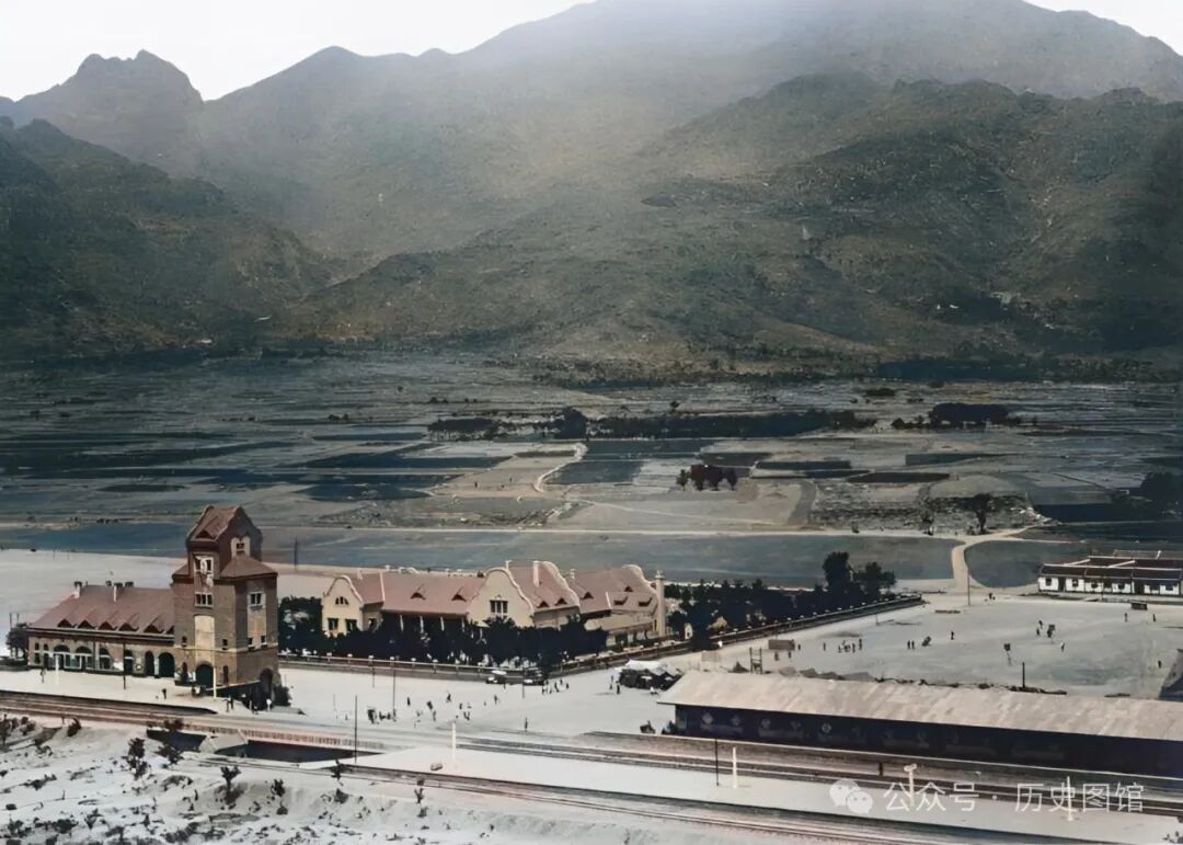 上面这张照片,拍摄于泰安火车站附近。有欧式的站房和长长的站台,规模不小。远处,连绵起伏的高山就是泰山。山脚下大片的农田,其间点缀着一些小村庄。