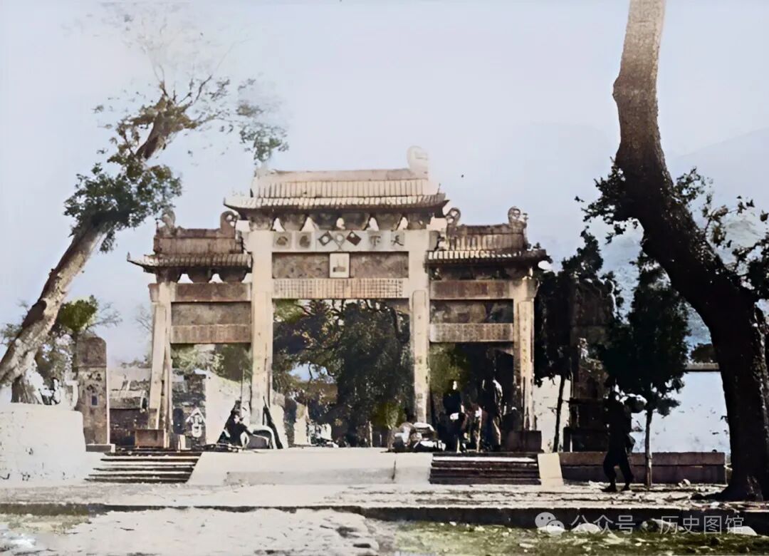 这座三间四柱石牌坊,建造精美,飞檐高挑,立柱横梁上雕刻精美的花纹,规格很高。照片中,一些当地人从牌坊前走过。