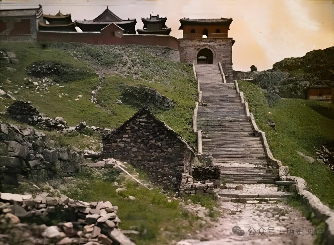 这座建筑,就是泰山著名的南天门了。100年前的南天门,斑驳的墙壁,看上去是那么的破旧,但依然难以掩盖其雄伟壮观的气势。南天门下,是陡峭的十八盘。山上看不到游客。