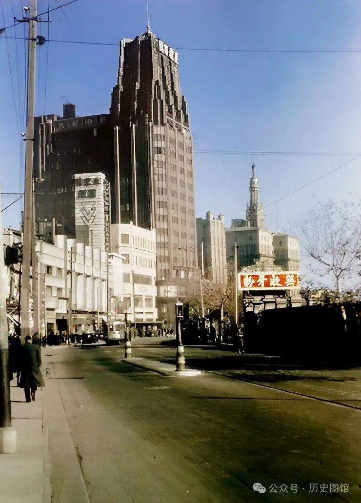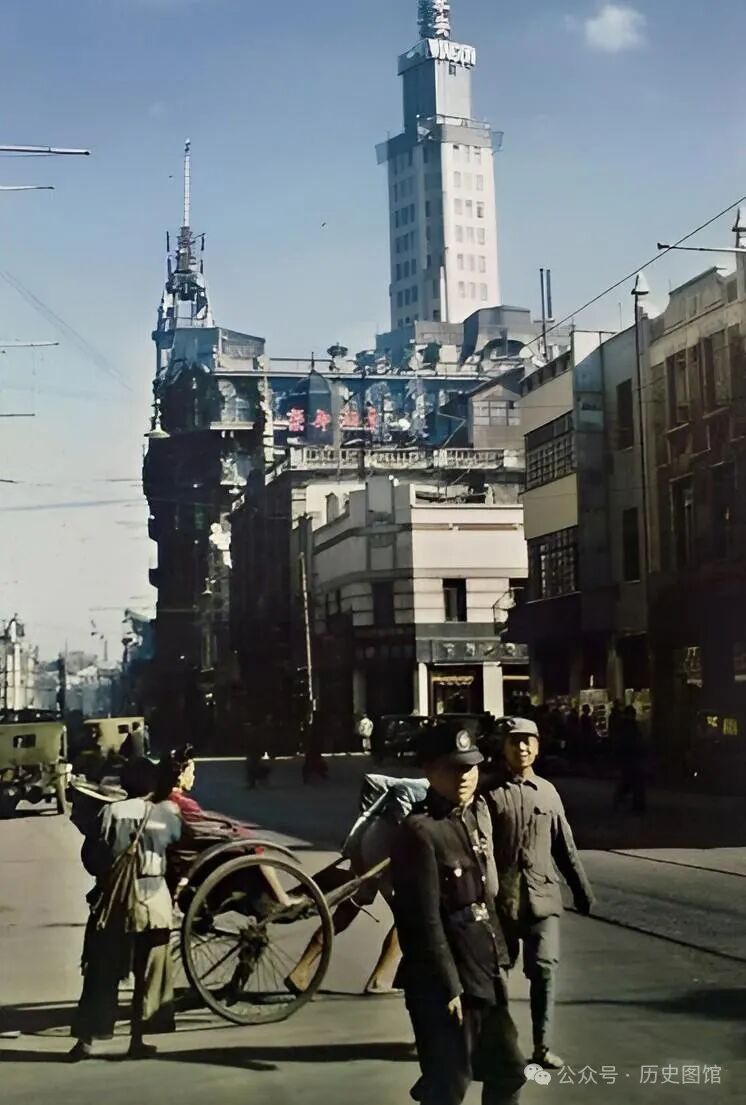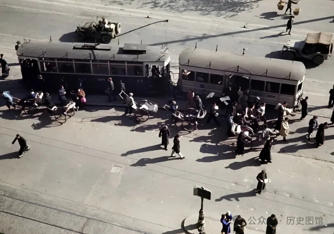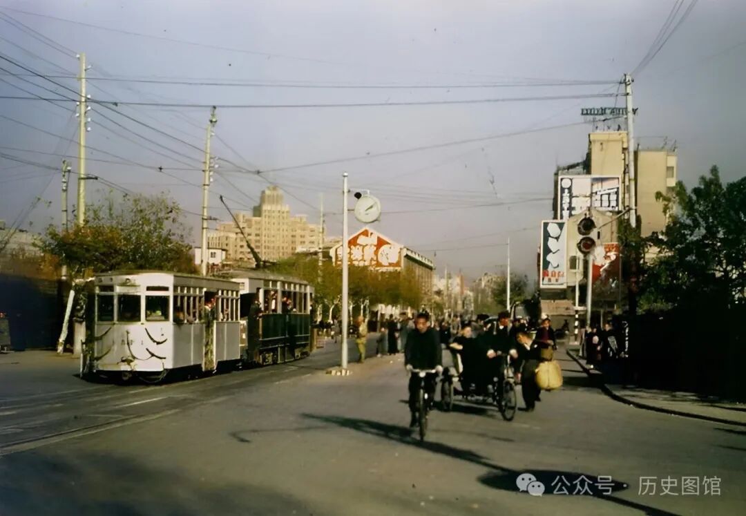 照片中,十字路口设有红绿灯,不少人骑着自行车从街上走过。一辆有轨电车正在缓缓驶来。抗战胜利前后,有轨电车一直行驶在南京路上,成为一道独特的风景。