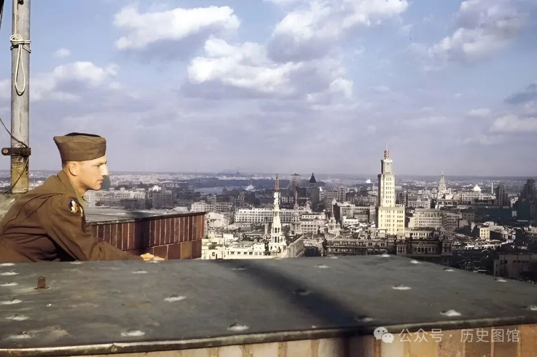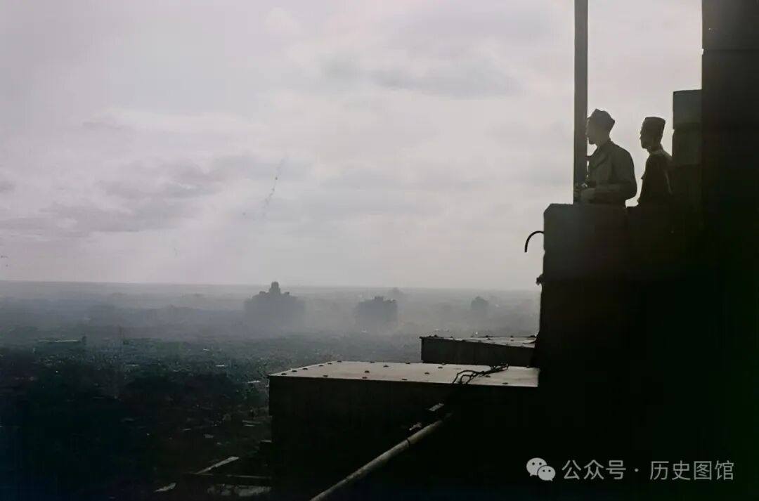 1945年,飞虎队员艾伦·拉森,站在国际饭店大楼高处,远眺上海城区的天际线。照片中间最高的建筑——新永安大楼,格外醒目。
