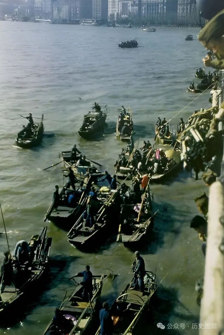 近处一艘军舰上,几名美军士兵趴在船栏杆上,低头看着江面上小贩们的船只。这艘军舰即将离开上海,返回美国。