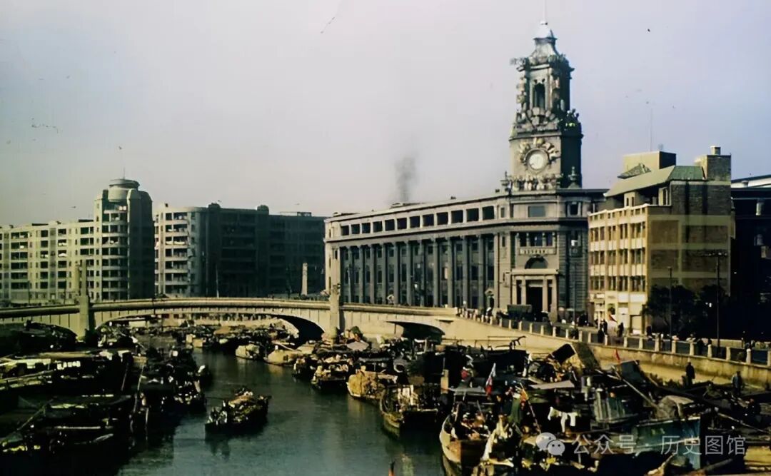 远处,横跨河道的大桥便是“四川路桥”,桥身优美,十分壮观。位于桥头屋顶有欧式钟楼的建筑,就是当时的上海邮电大楼。