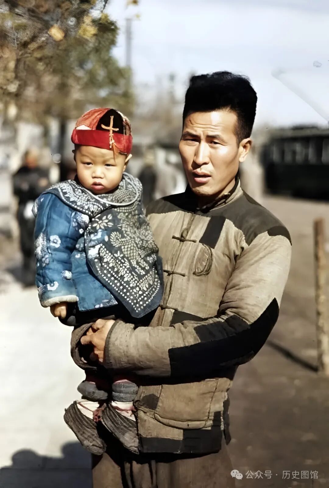 男子身上穿着有很多补丁的衣服,孩子身上的衣服却很漂亮,头上戴着红色的帽子。可见他对孩子疼爱有加。在镜头前,两人的脸上露出了好奇的表情。