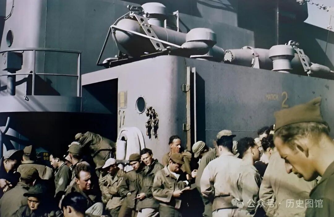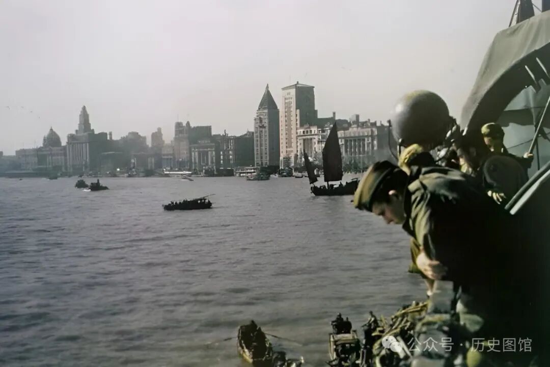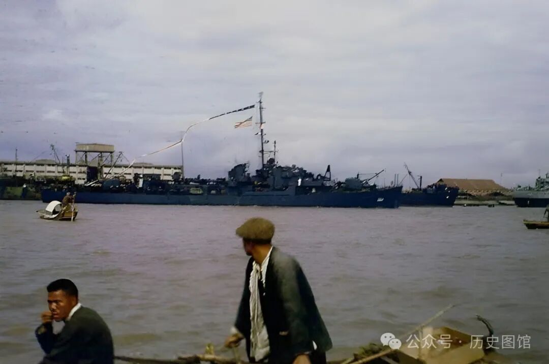 黄浦江上,停着一艘美国军舰。美军士兵挤满了军舰的甲板。他们即将乘坐军舰,返回美国西雅图,每个人表情各异。摄影师在船头拍下了这张照片。