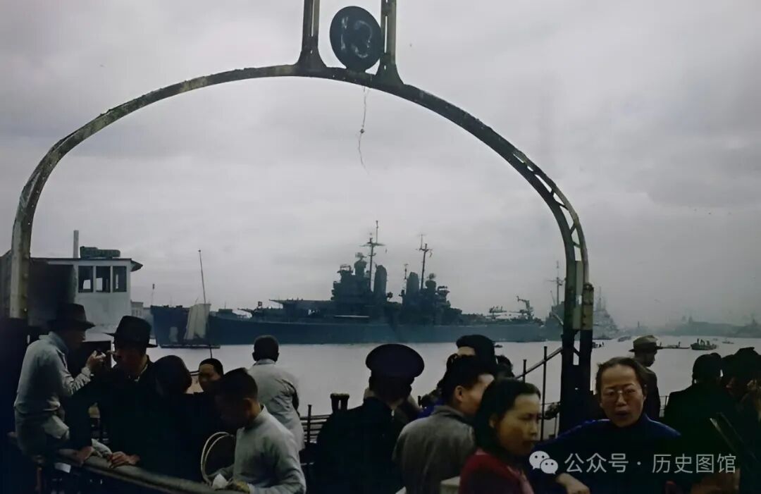 1945年,上海两名渔民驾驶小船驶过黄浦江江面。其中一名戴着鸭舌帽的男子,回头看向停靠在江边码头上的一艘军舰。那艘军舰,是美国太平洋舰队重型巡洋舰“圣保罗”号。
