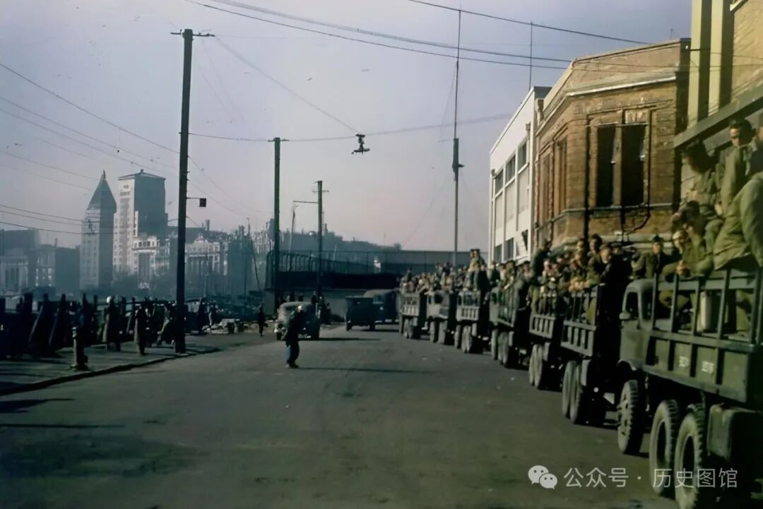 40年代,十几辆美军卡车从上海街头驶过,车上坐满了美国士兵。这支车队正在前往黄浦江边码头,登上停泊在那里的军舰,然后返回美国西雅图。