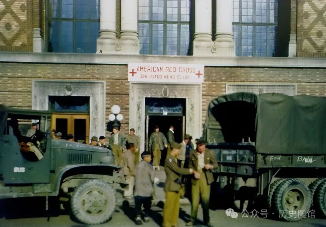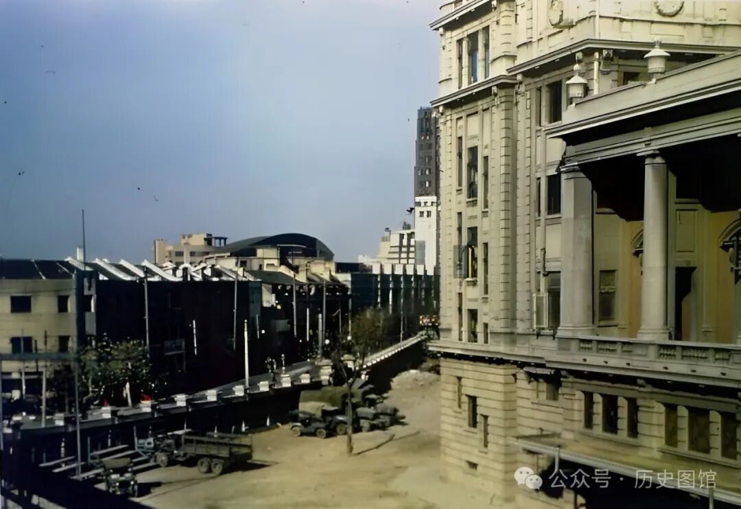 这张照片,拍摄于上海跑马厅对面。背景大楼是美国红十字会所在地,楼前停着几辆军车。一些飞虎队员正准备乘坐军车游览大上海。