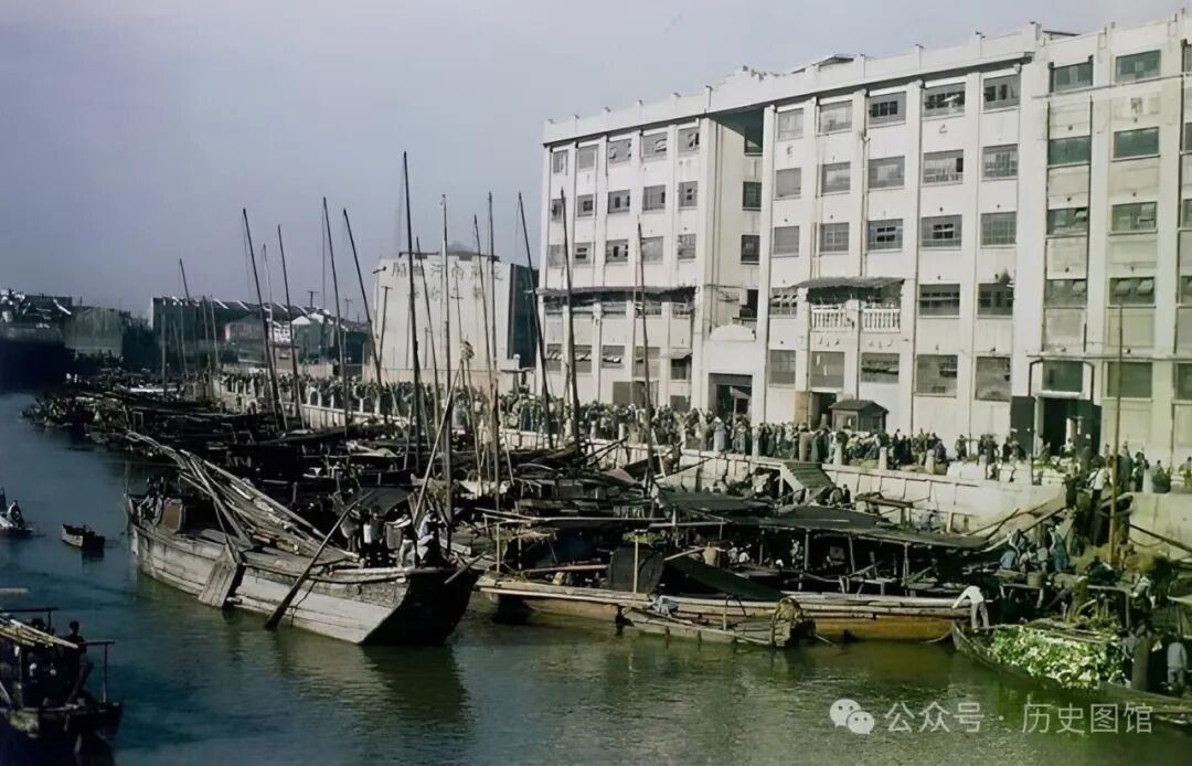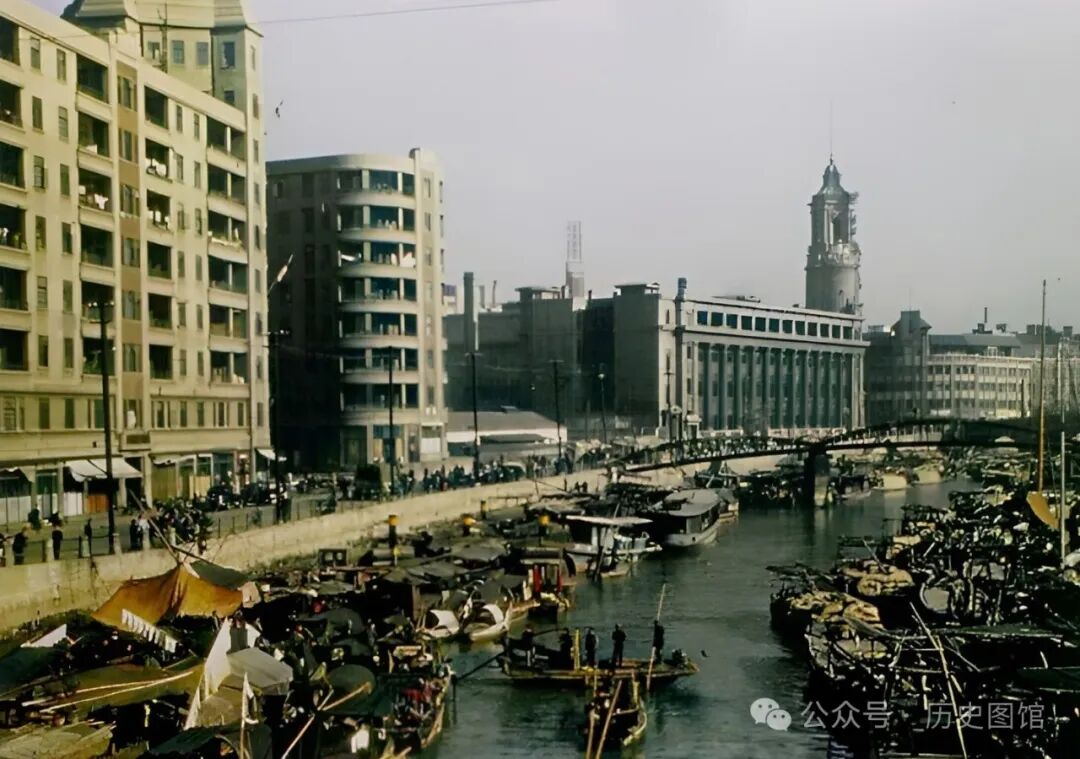这是40年代的苏州河景象。远处有钟楼的大厦,是当时上海著名的邮电大楼。