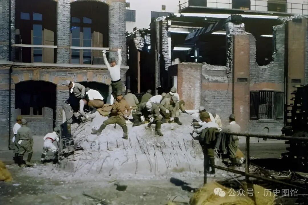 1945年,上海街头。十几名日军正在拆除一座圆形碉堡,水泥被砸开后,露出了钢筋。一名日军抡起铁锤,砸向碉堡。其他日军则用锤子和凿子,一点点拆除碉堡。