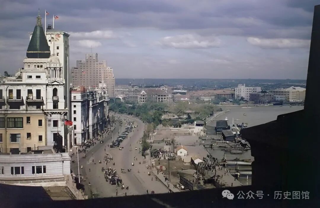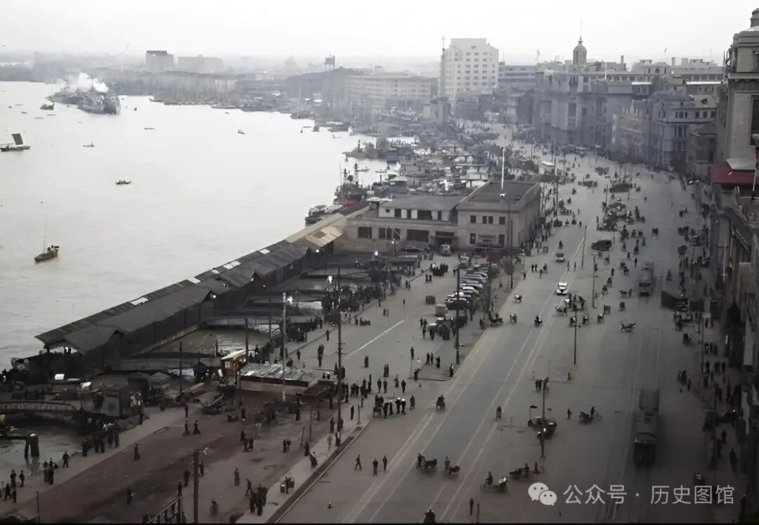 40年代的上海外滩。外滩西侧,矗立着52幢风格迥异的欧式古典大楼,素有外滩万国建筑博览群之称,成为旧上海时期的金融中心、外贸机构的集中带。