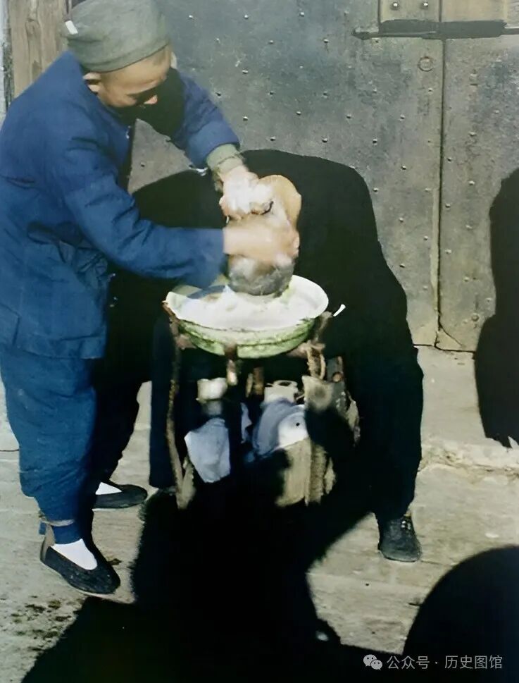 1945年,苏州河畔,一名理发师正在为顾客洗头发。在当时,这样的流动理发摊很常见,他们挑着扁担,一头装的是理发工具,另一头装的是脸盆和热水。只要有人需要,他们可以随时停下来理发。
