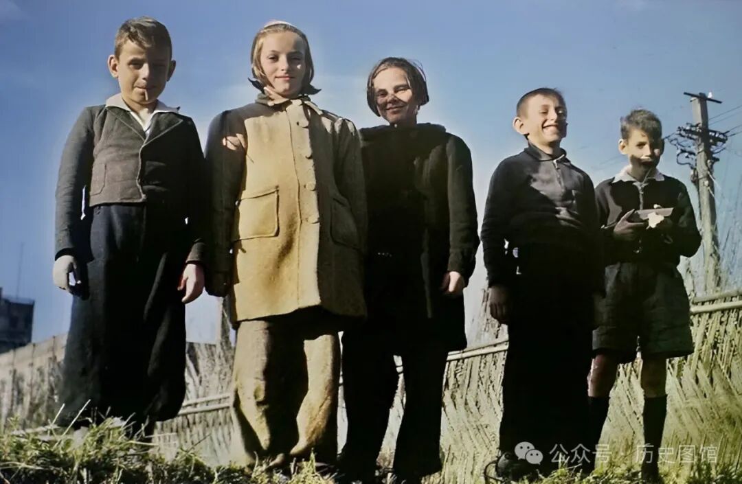 照片中这几名孩子是犹太人。为了躲避迫害,他们跟随大人从欧洲来到中国上海。日军占领上海后,没收了他们的房屋和财产,并将他们关押在位于虹口的仓库里,没有了活动自由。