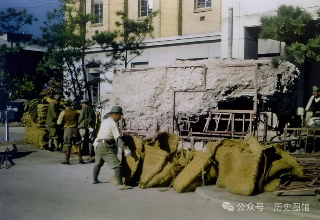 上海街头,一些日军士兵正在拆除他们昔日修建的碉堡。碉堡的水泥被砸碎后,露出了里面的钢架,很多都是日军从老百姓手里抢来的铁质门窗,作为骨架浇筑进水泥里。