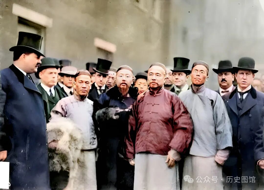 头戴礼帽的西方人,簇拥着天朝来使。走在中间的人,是户部侍郎戴鸿慈和湖南巡抚端方,两人身穿高级丝绸马褂、貂皮大衣,几名便衣保镖守护左右。这阵容可谓豪华。