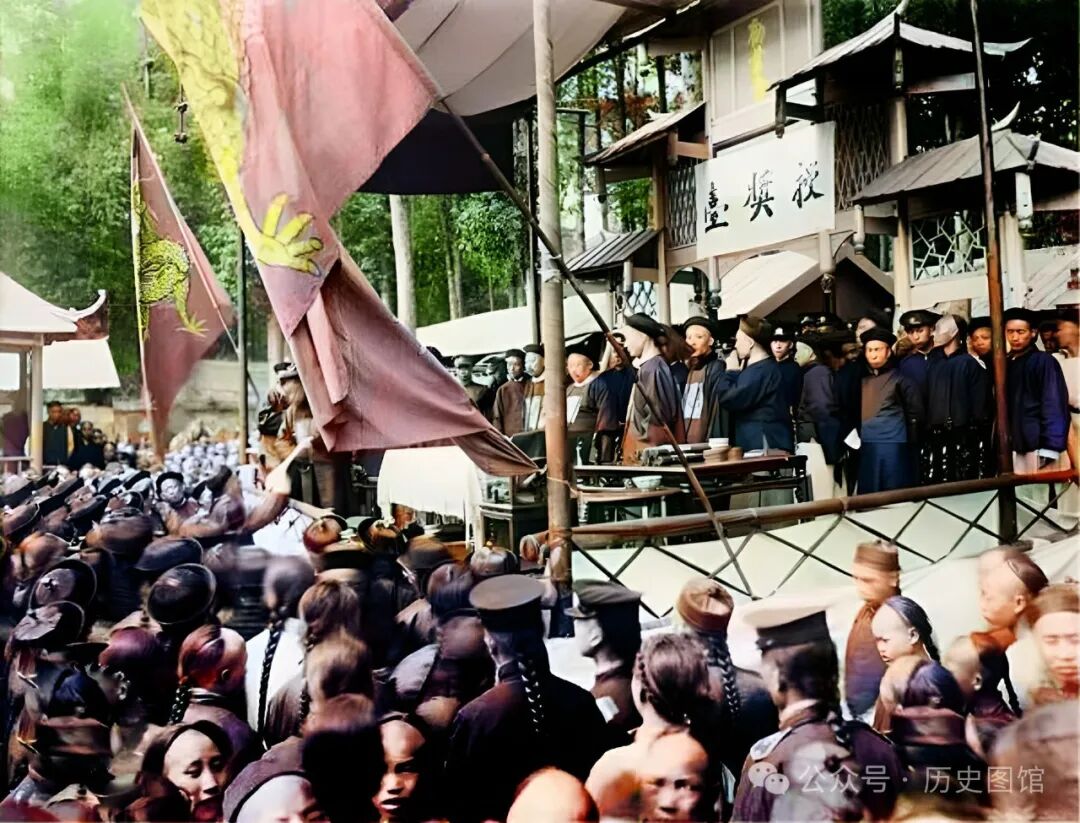 照片中,搭起的台子前挤满了人。这是100多年前发生在四川省成都青羊花会上的一幕。当时这里正在举办“第四届劝业会及授奖仪式”。