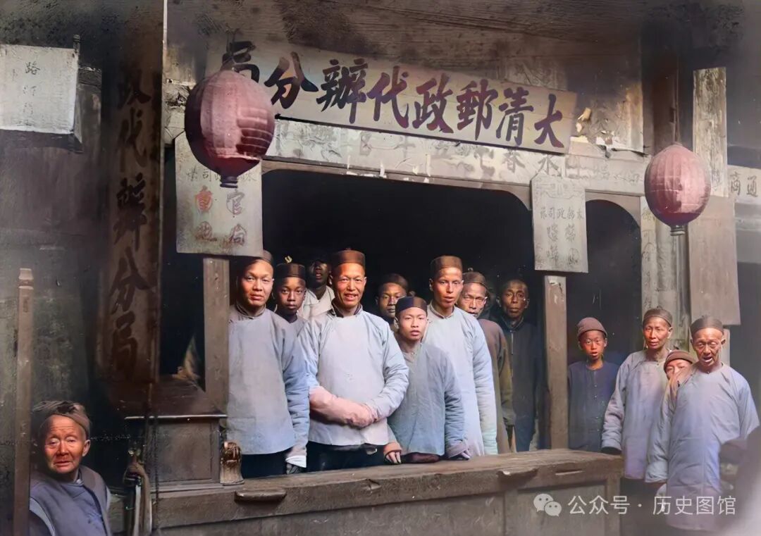 ,位于福建永春的大清官办邮局,工作人员站在柜台前合影。柜台上方的匾额上写着“大清邮政代办分局”几个大字。两侧悬挂的木牌上写着“禁止喧哗”等字样。
