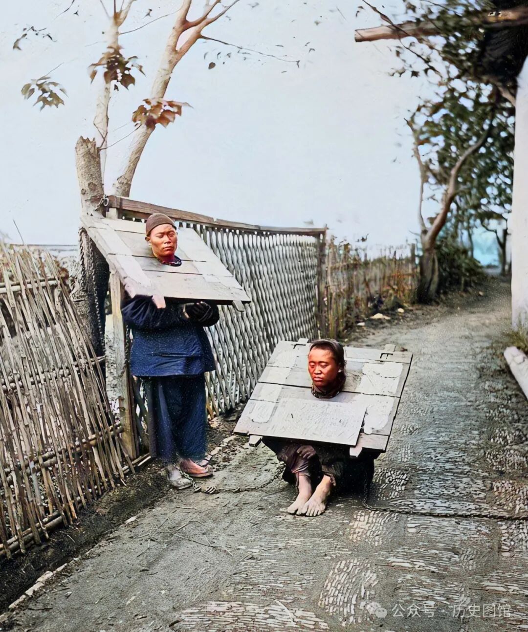 两名罪犯戴着沉重的木枷,脚上绑着铁锁链。他们被罚在路边示众,面对众人的围观和议论。两人脸上的表情很复杂。