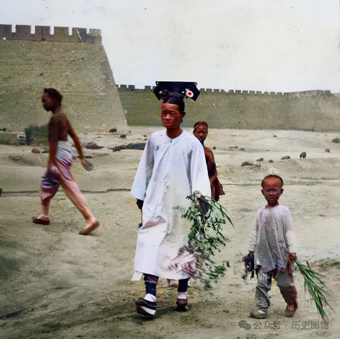 清朝末年的北京城外,一名长相清奇的女子,带着自己的孩子从城墙外的大路上走过。她身穿旗袍,头上戴着旗头。看到她的面容,你想到了谁?母子二人手里都拿着采集的树枝和青草。背景里,突出城墙外的方形敌台高大壮观。