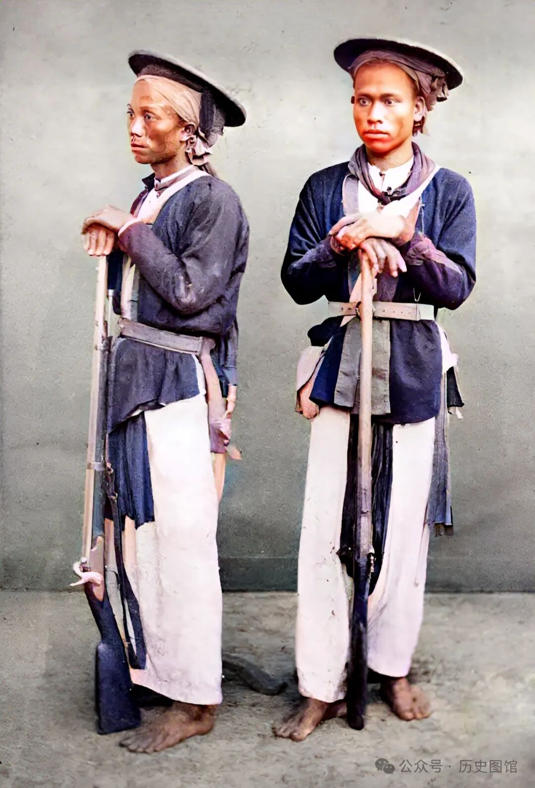 这梁宁士兵打扮的男子,是晚清时期的地方乡勇,类似于现在的民兵。他们身穿统一服装,拿着落后的武器。他们身材消瘦,光着脚,训练不足、纪律废弛、战斗力低下。