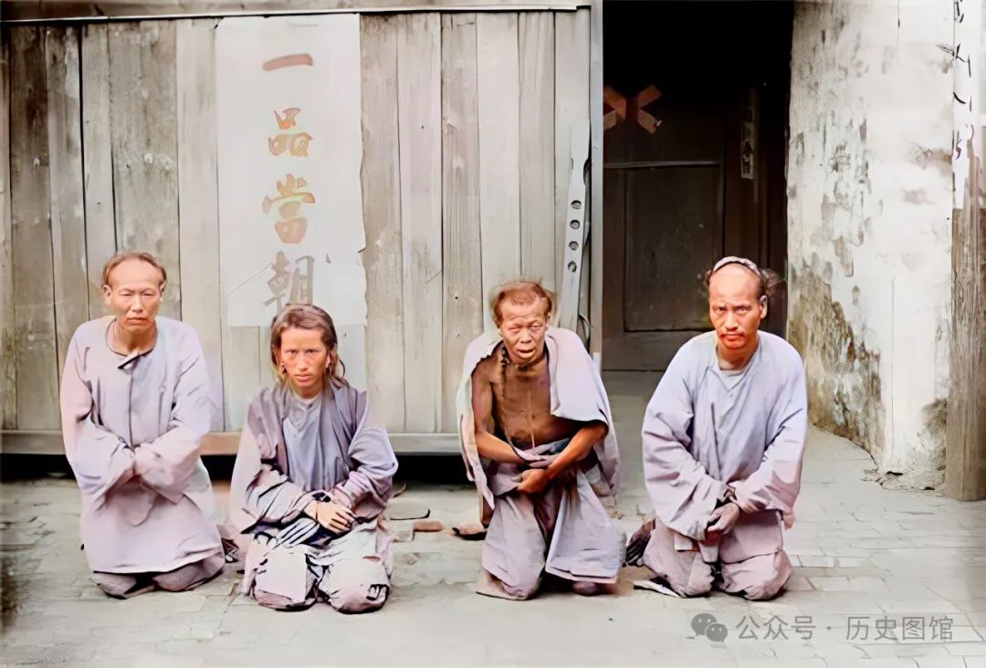 照片中这四名男子,卑微地跪在地上。他们的名字分别叫:杜朱衣、郑淮、刘祥兴、张赤四。在一次反抗活动中,袭击了当地的一些外国传教士,并洗劫他们的财物。因此,四人被抓了起来。他们身后的门板上写着一品朝堂几个字。他们最后的命运如何,不得而知。
