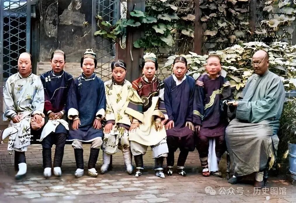 清朝时期,一名家境殷实的男子,和自己的七个妻妾坐在院子里合影。这些满汉女子长相各异,穿着不同的服饰,年龄也不同。不得不说,这名男子还是很有实力的,光是协调这么多妻妾之间的关系,他就得有过人之处。