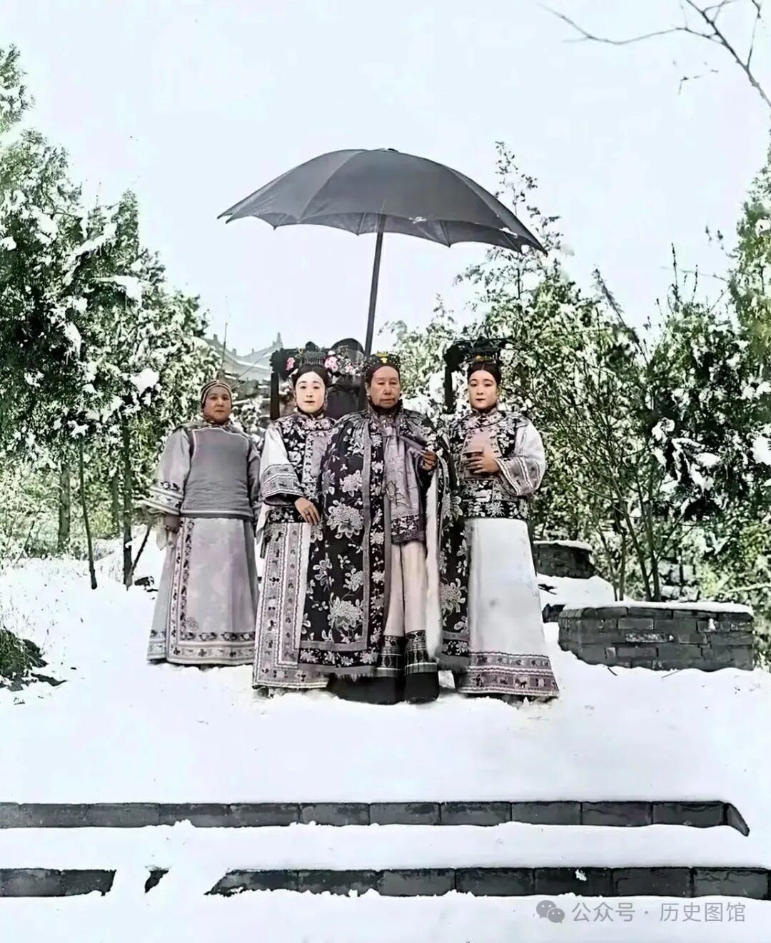 1903年,慈禧太后在几名福晋和太监的簇拥下,来到颐和园赏雪。雪后的颐和园银装素裹,静悄悄的。