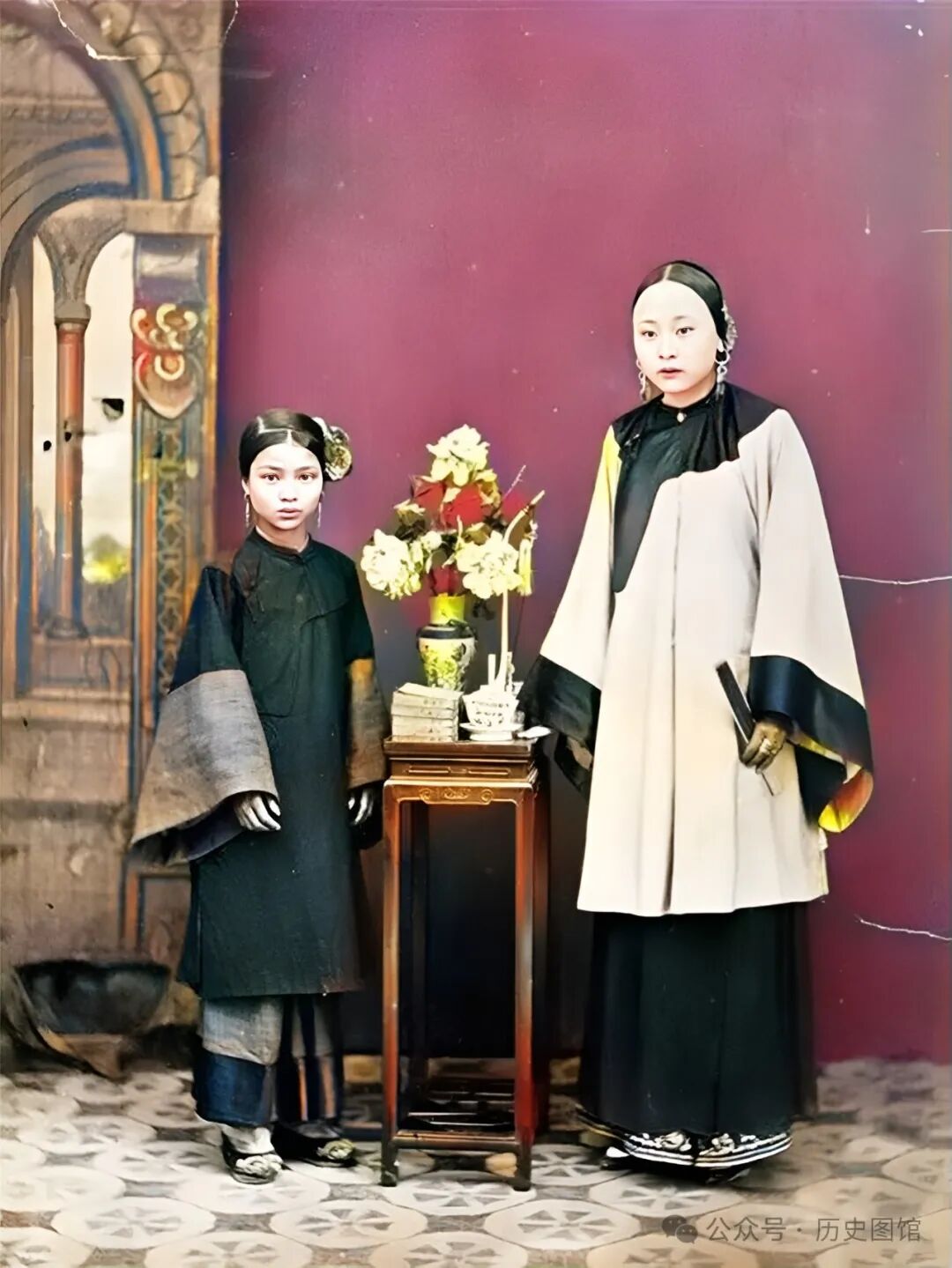 在过去的封建时代,有一种丫鬟叫通房丫头。照片中,身穿华服的女子旁边,站着的小女孩,就是一名通房丫头,跟随女主人出嫁的男方家。
