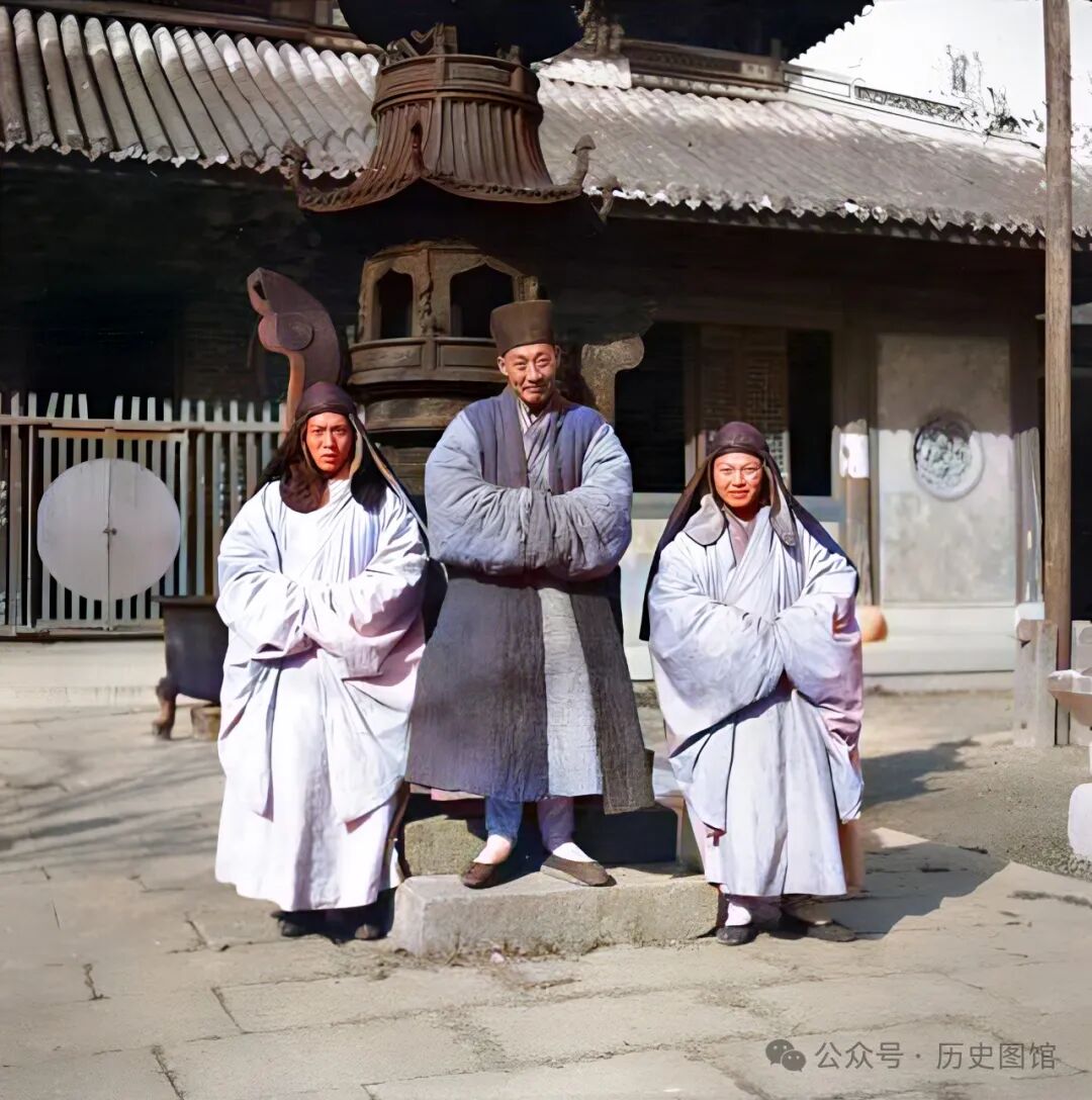 中间这名男子,身穿僧袍,头戴棉帽,笑容可掬。站在他左右两侧的是尼姑,她们俩身穿白色长袍,裹着长头巾,其中一人还带着眼镜。