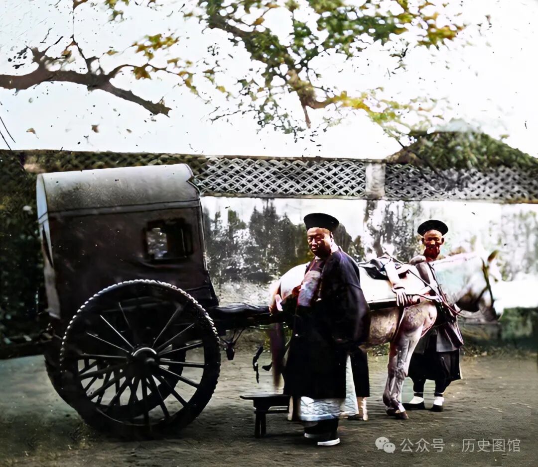 清朝时期,一名官员乘坐马车出行时的情景。在过去,只有三品以上的官员才有资格乘坐轿子。更多的官员坐马车出行,不仅成本低,而且速度更快。