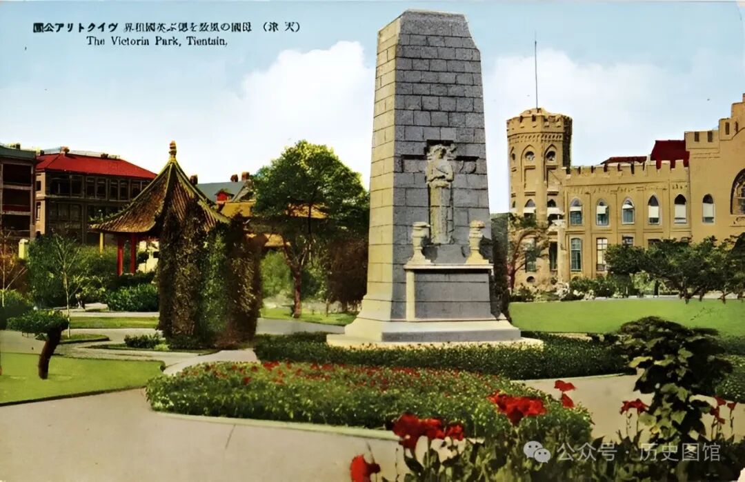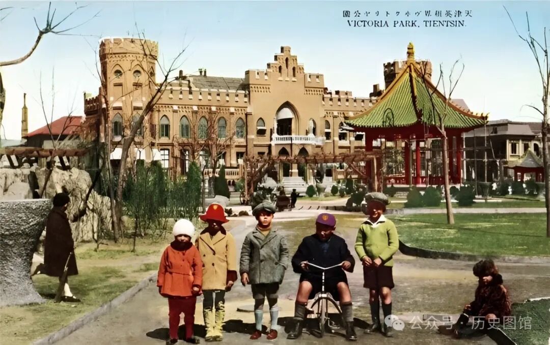 民国时期,位于英租界戈登堂前的维多利亚公园里,几名英国孩子正在玩耍。1937年,天津英租界维多利亚花园,张灯结彩,进行了庆祝英王乔治六世登基加冕活动的相关布置,场面非常宏大。