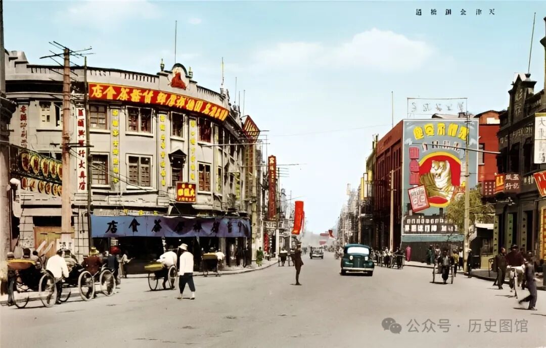 这是民国时期天津金刚桥附近街景。街道宽阔笔直,一眼望不到尽头。街道上汽车、黄包车来往穿梭。街边建筑上,有各式各样的广告牌,商业气息浓郁。