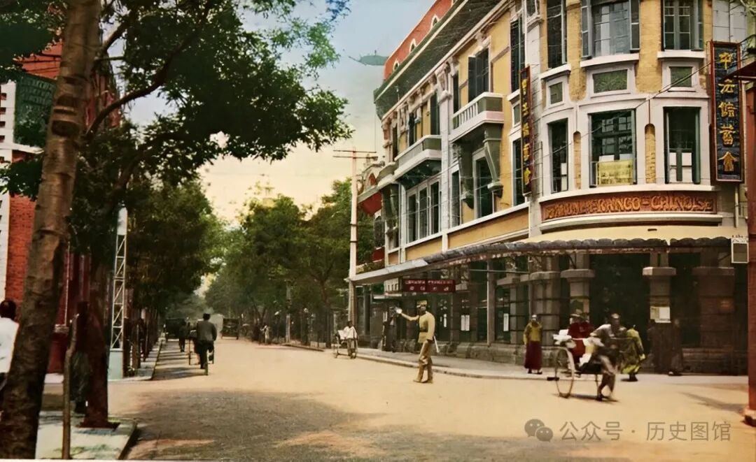 这是日租界北旭街景象。照片右侧建筑,是当时天津著名的“老九章绸缎庄”。创始人叫严信厚,老九章绸缎庄始建于1883年。老九章绸缎庄是天津著名的百年老店,现为市级文物保护单位。