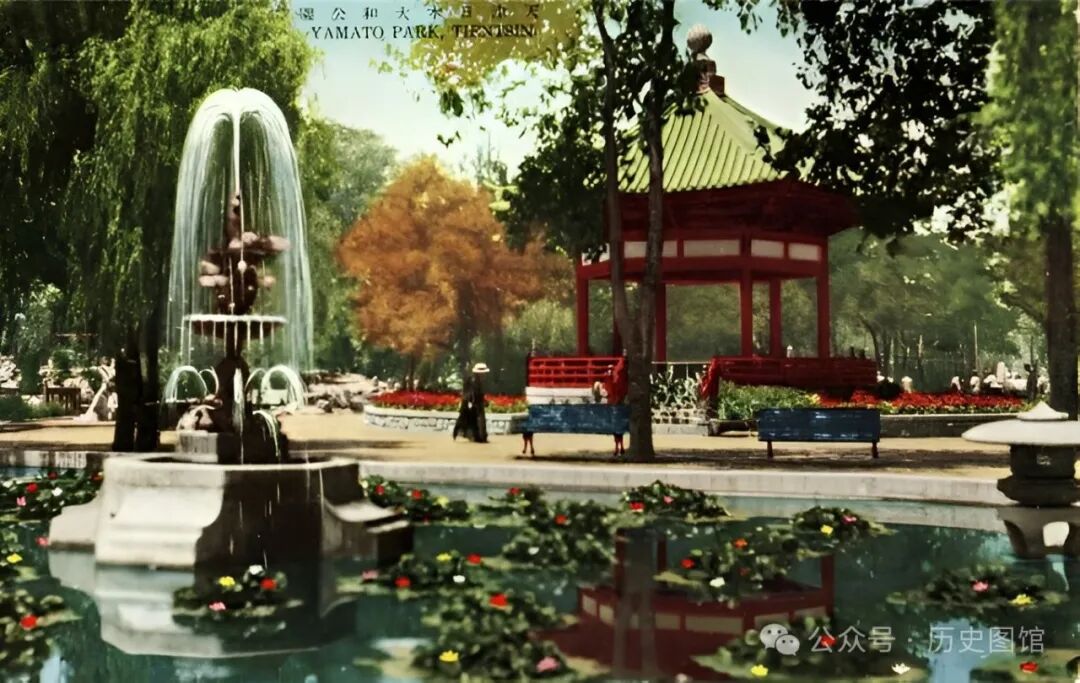 日租界,作为日侨在天津生活的主要据点,其界内开设了多所学校和医院,以及公共设施和娱乐文化设施。照片中是“大和公园”内的景象。荷花池中间有一座喷泉。